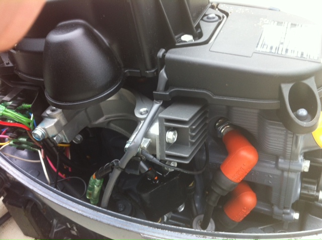 onder de gelijkrichter regelaar (vermoedelijk onderdeel 68T-81960-00 maar dat terzijde) naast de bougies. Dat zou best eens een afvlakcircuit kunnen zijn, waardoor van de uitgaande spanning van de regelaar geen pulserende (zoals in de afbeelding) maar een keurige gelijkspanning gemaakt wordt. Over het aansluiten van de accu heb ik me uitgebreid laten voorlichten door Yamaha dealer van Wieren in Sneek. Een van de redenen daarvoor was het feit dat in de gebruikershandleiding van de motor niets te vinden is over dit onderwerp. Zelfs over de specificatie van de (ook op de foto zichtbare) bedrading is daarin niets te vinden. En dus ten dele maar hier. Vanaf de stroomspoel (onder het vliegwiel) komen 2 groene draden, waarop (laten we zeggen) bij draaiende motor wisselspanning staat. De spanning neemt toe bij een hoger toerental. De stroomspoel is (voor alle duidelijkheid) op geen enkele manier gekoppeld aan het CDI motorontstekings circuit. Deze groene draden zijn te vinden door de rode