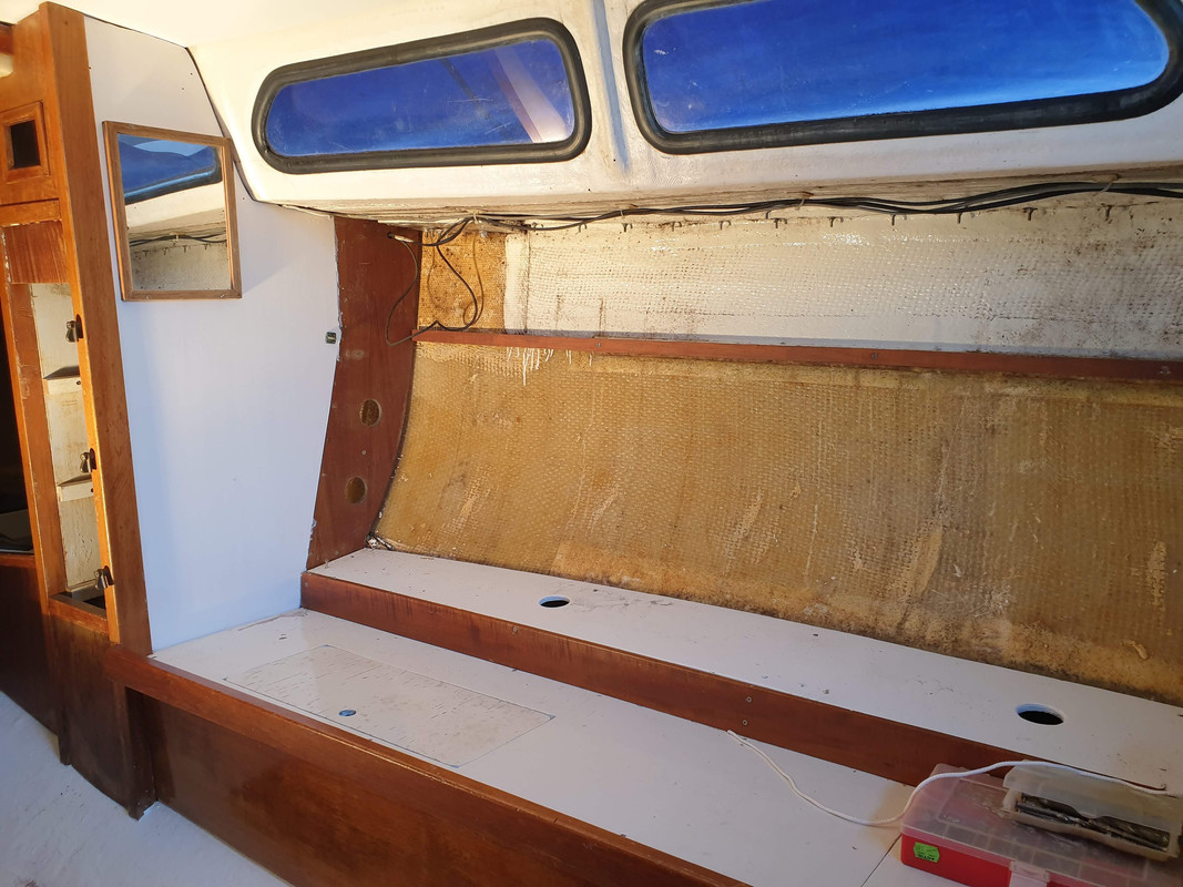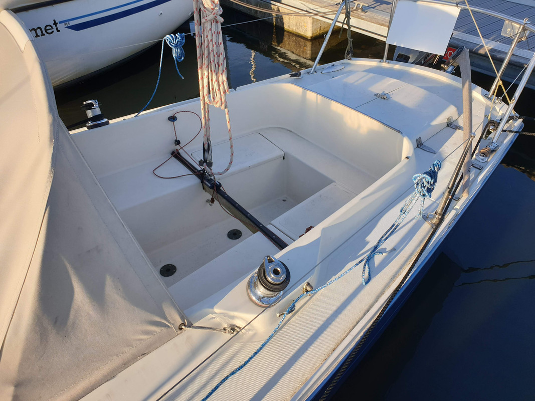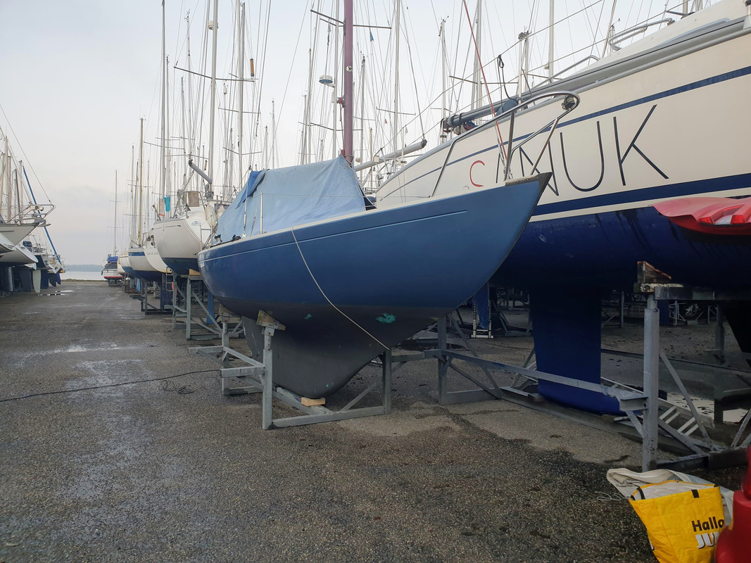 De "if" staat op de wal. Opvallend klein ding eigenlijk tussen alle moderne 30-45 voets geweld en met 125 diepgang is er ook maar een klein laddertje nodig. Er zat een oud dekzeil bij, dat nog goed bruikbaar lijkt en de kajuit en kuip afdekt. Windvang is ook wat minder als je lager bent dan de meeste buren.
