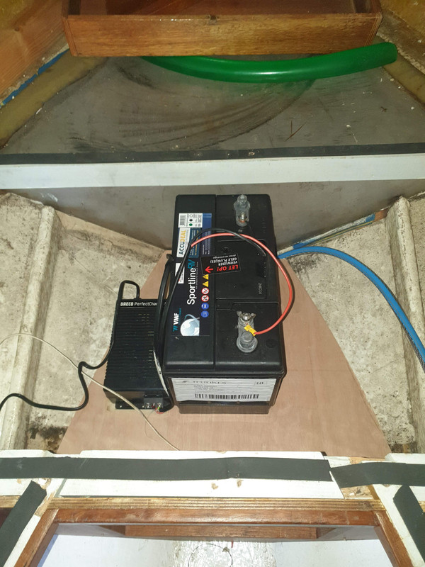 Binnen is er intussen een plateautje pas gemaakt voor accu en lader in het vooronder. Nu weer thuis om te schilderen en te voorzien van een fixatie vd accu.
