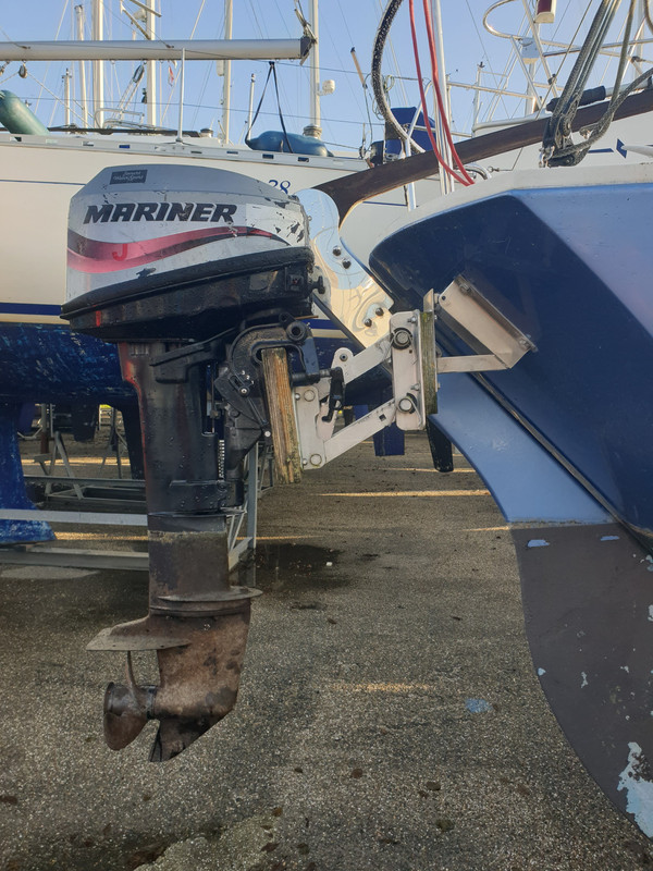 Die handstartende 8pk 2cilinder 2takt weegt 27kg en is er zo af. Hij staat nu binnen bij de werf voor een complete onderhoudsbeurt (rond 100€) en het voorjaar gaat ie er weer op.