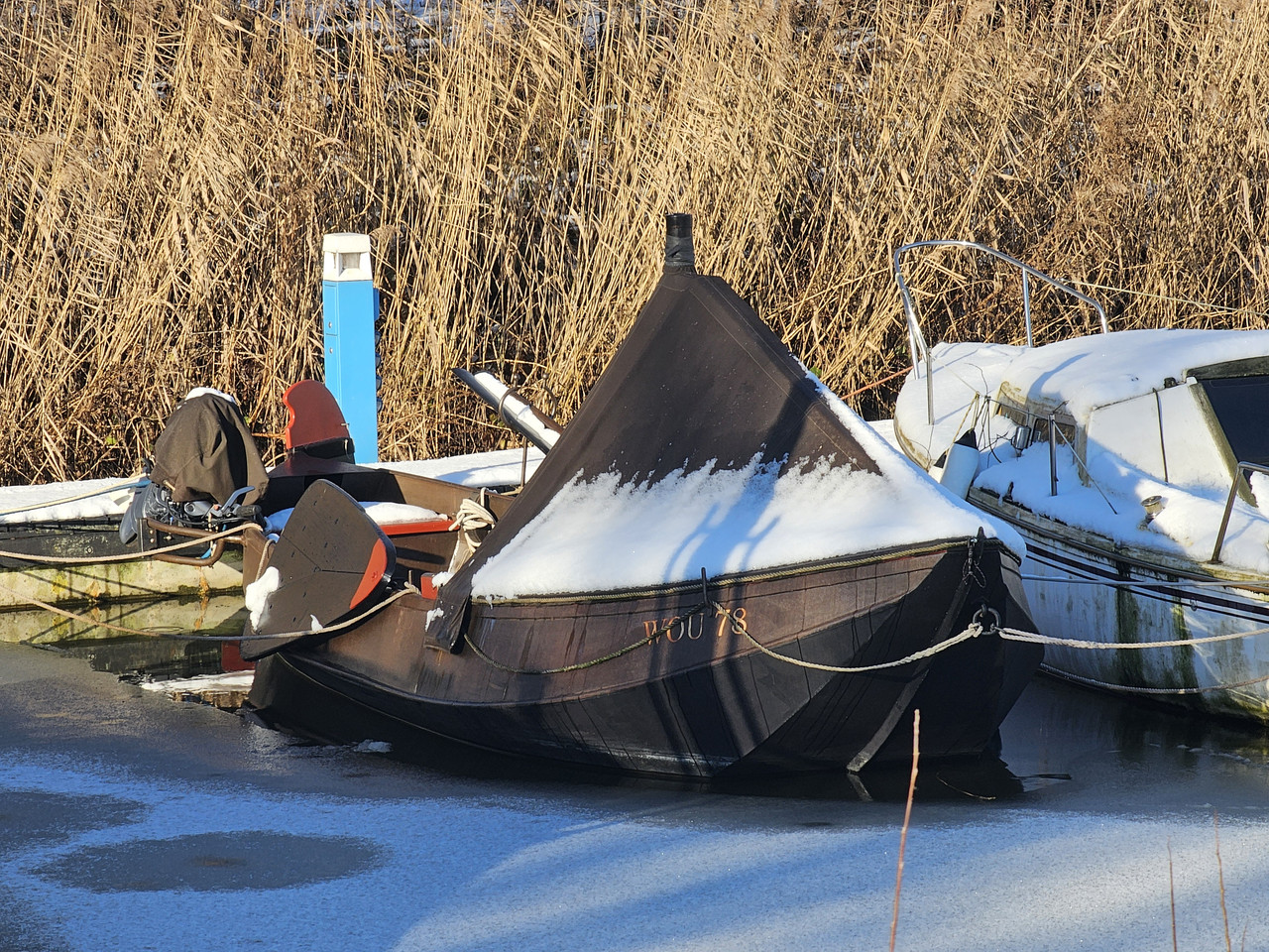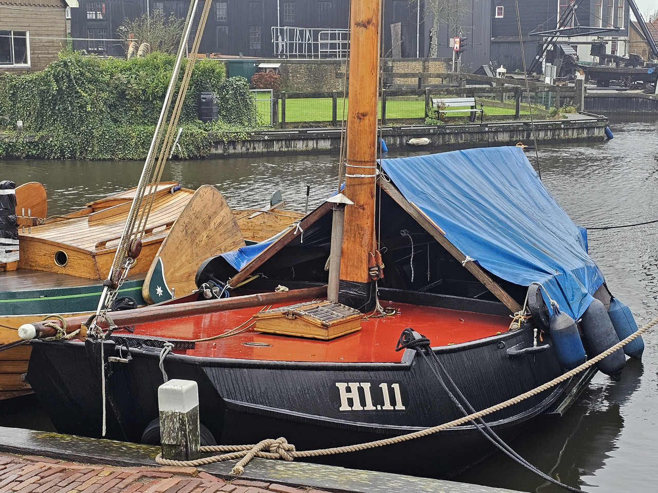 Op de Zalmschouw zie je vaak het hele jaar volledige afdek tenten. Blijft ook weer heel gedoe om snel het water op te gaan. Zo'n Zalmschouw heeft geen giek, dus extra stellage nodig. Dat zou voor de winter wel handig zijn ivm regen.