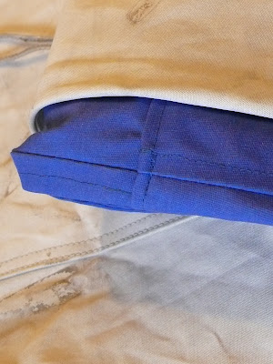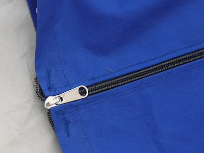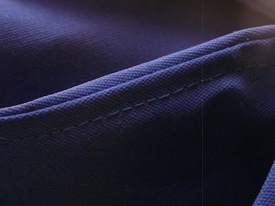 Het materiaal wat ik gebruik heb is polyester-katoen van 450 gram/meter2. Dit is vrij stug materiaal. Voordeel is dat het makkelijk te 'vouwen' is, bij een naad e.d. Nadeel is dat het bij het naaien niet soepel is.