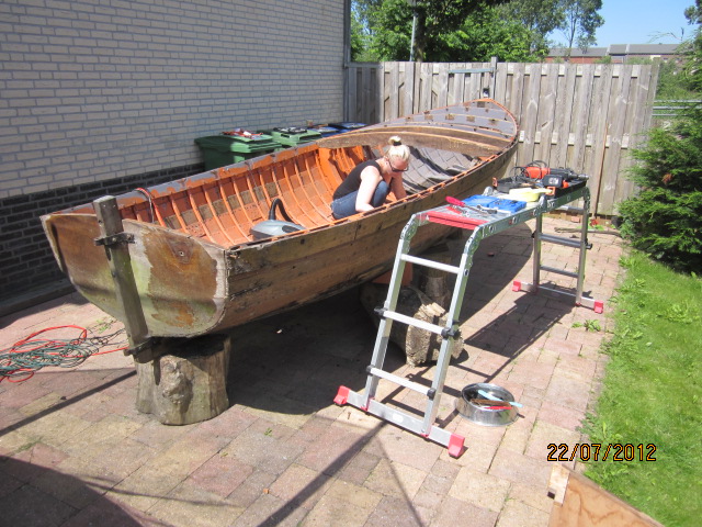 Vervolgens maak je de boot optisch dicht. Gaten vul je op met kleine delen hout, klinknagels kun je vervangen enz. Vaak is het niet mogelijk de romp mooi blank te maken, maar geschilderd met bv een mooie blanke nieuwe bovenste gang is ook mogelijk.