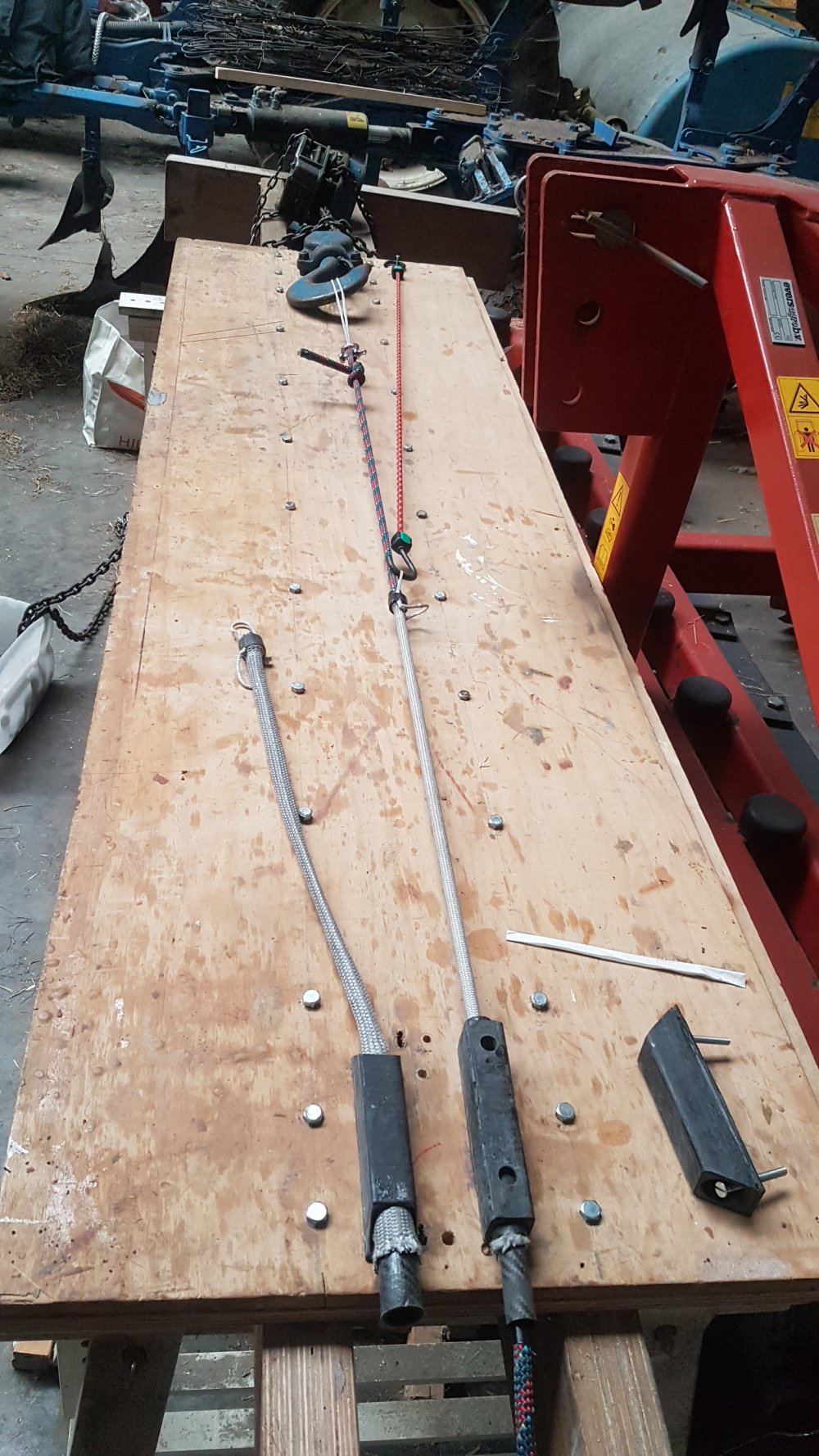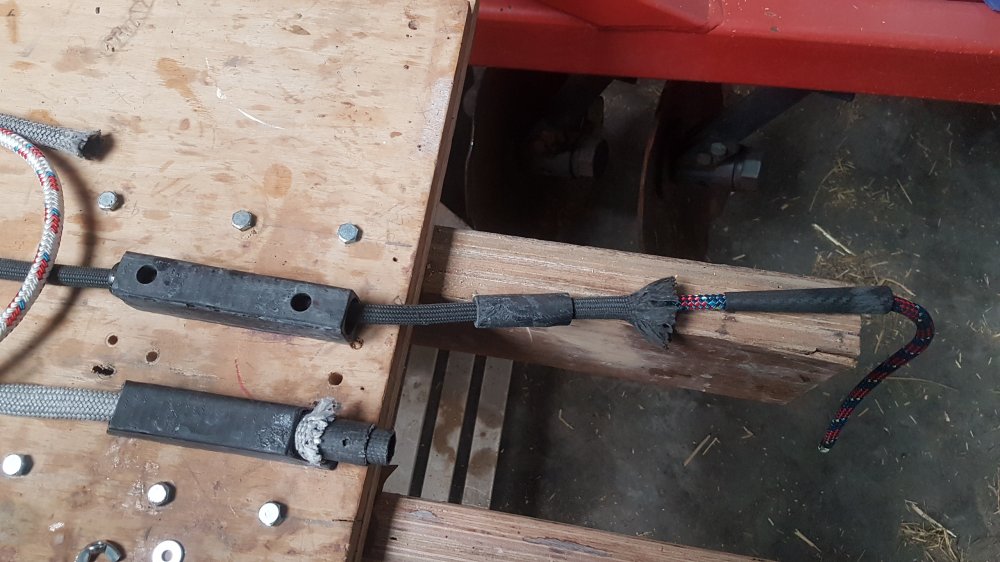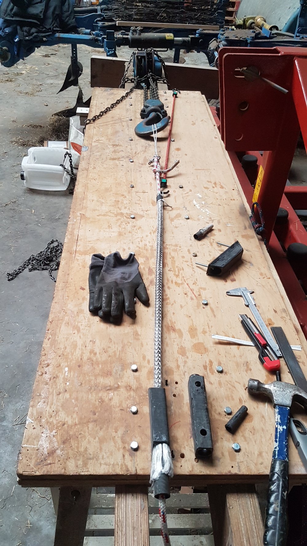 Overzicht van de test opstelling met de enkelvoudige klem en een Dyneema kous. Helaas konden we de tweedelige klem niet gebruiken omdat zowel klem als cone te smal zijn voor de dyneema kous. Deze zullen flink zwaarder uitgevoerd moeten worden, iets voor een volgende keer.