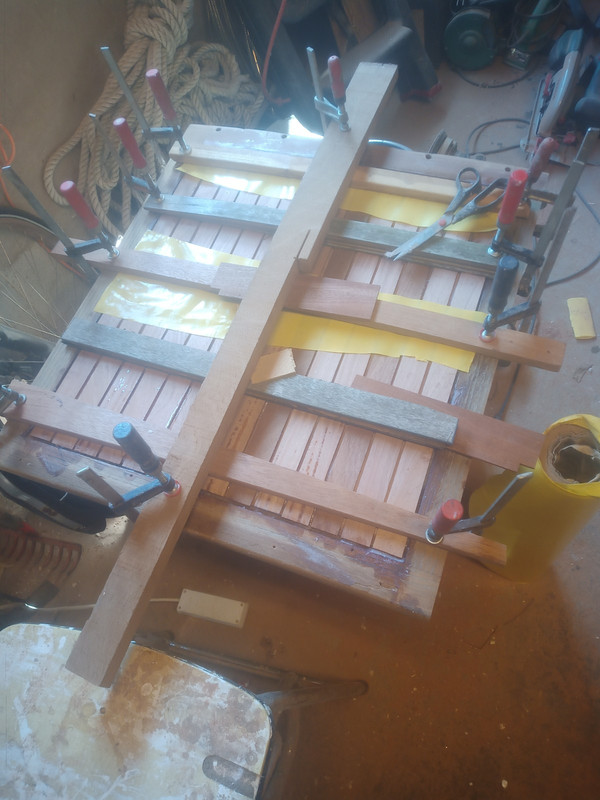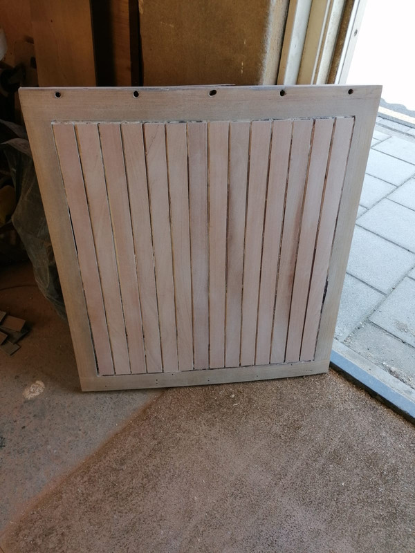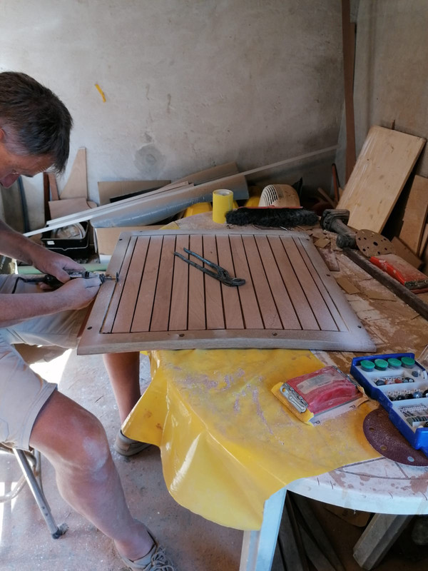 Laatste projectje was de restauratie van het schuifluik en garage van de achterhut. Deze had inmiddels wat ongewenste flexibiliteit gekregen. Onder het mahonie was het mahonie hechthout deels gedelamineerd of verdwenen.
