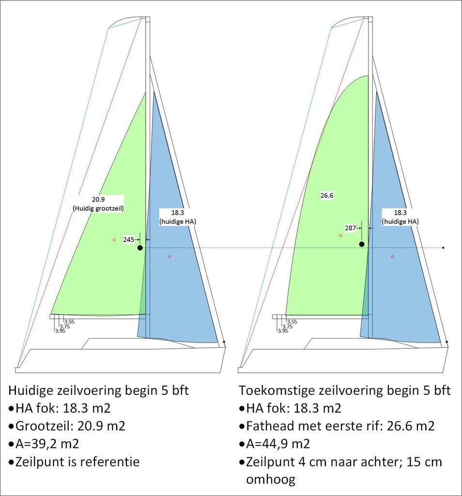Links het huidige (bijna) driehoekige grootzeil, ongereefd met ongereefde HA. Dit kan nu nog nét bij begin 5 Bft. Straks staat er iets meer (maar wel wegtwistbaar) zeil. Zeilpunt ligt 15 cm hoger. Bij 20 graden helling komt dit dus sin(20)*15=5 cm verder naast de boot te liggen als nu. Dat valt wel te overzien lijkt mij.