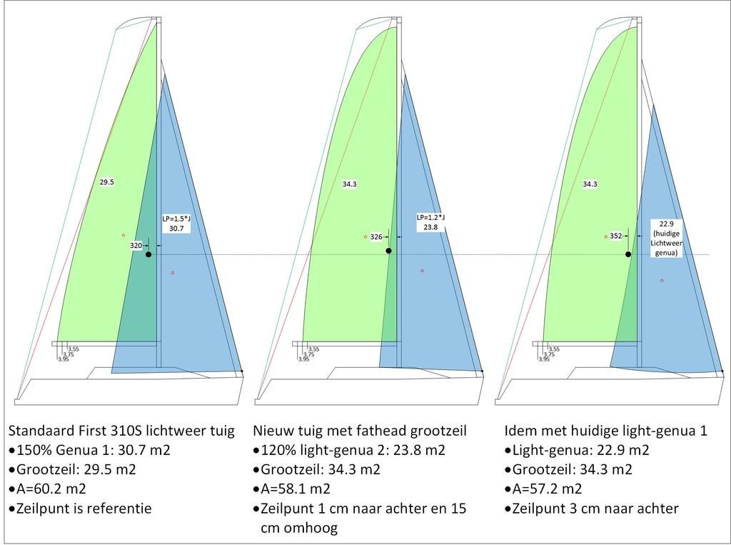 Het linker plaatje is het First 310S standaardtuig. De dikke zwarte punt is een maat voor het zeilpunt; ik gebruik dit als referentie voor de tekeneingen rechts daarvan. Het echte zeilpunt ligt bij een vleugelprofiel verder voorlijk; hier zijn slechts de gewogen-zwaartepunten geconstrueerd. Dit wordt in POYD en vele andere ontwerpers gebruikt om zeilplannen te tekenen en zou voldoende nauwkeurig moeten zijn voor vergelijkingsdoeleinden.