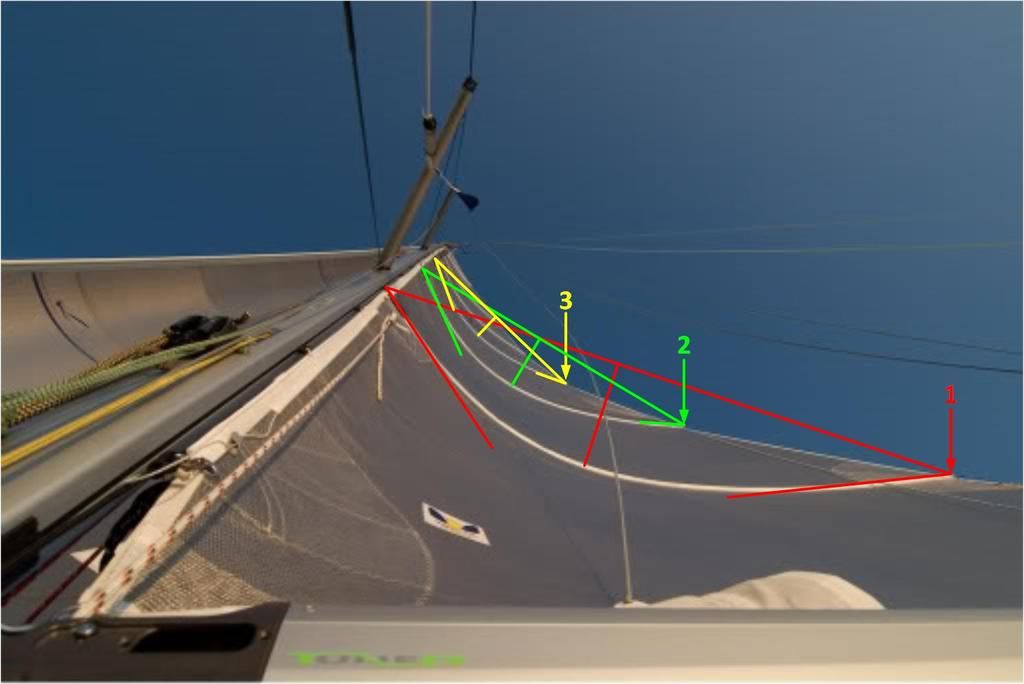 Mijn vraag ging er dus over of deze "ingebouwde twist" voor een fathead anders (groter of kleiner) zou moeten zijn dan bij een driehoekig zeil. Ik weet wél dat je een fractioneel grootzeil met méér twist vaart dan een toptuig (vanwege een kleiner downwash effect van het voorzeil bovenin), maar ik weet niet waarom dat dan ook nog zou moeten verschillen tussen een fathead en een driehoekig zeil. Misschien moet die ingebouwde twist bij een fathead juist láger zijn omdat het van nature al uit wil waaien bovenin en je met het strak trekken van het achterlijk de toplat (in plaats van het headboard zoals bij een driehoekig zeil) te zwaar zou gaan belasten? Dus echt een "flying shape" effect, onder belasting?