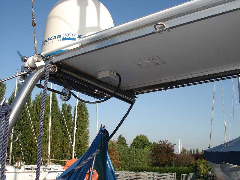 Mijn extra marifoon antenne staat achteraan gemonteerd op de davits.