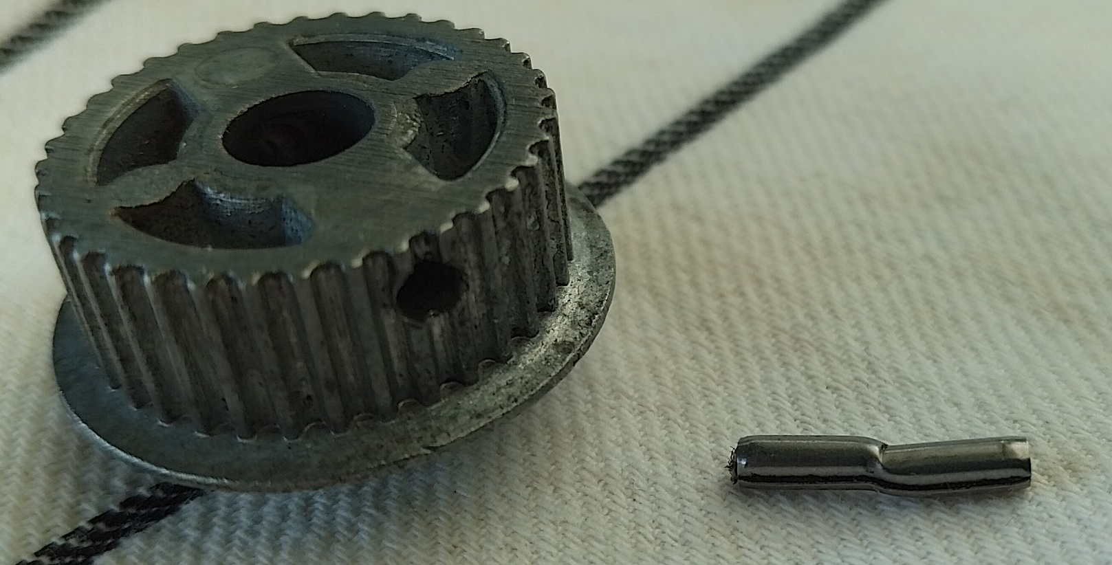 Het blijkt dat dan het 2 mm spanhulsje dat de spindelarm met de motor verbindt gebroken is.