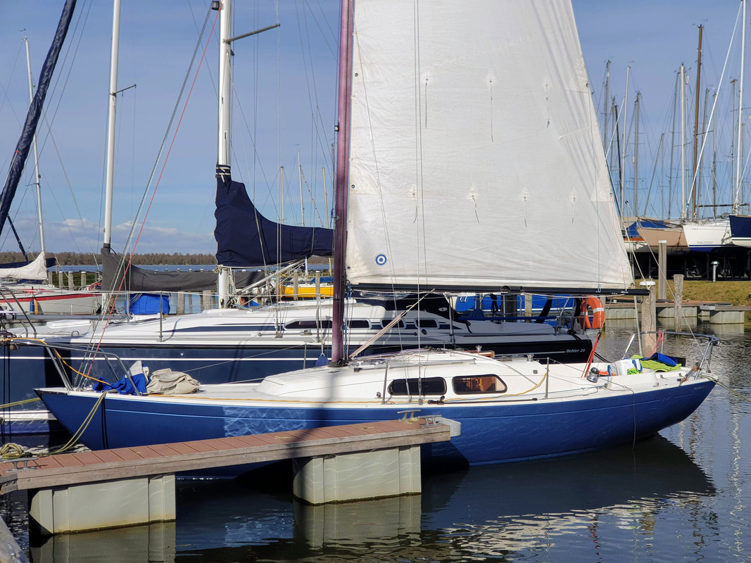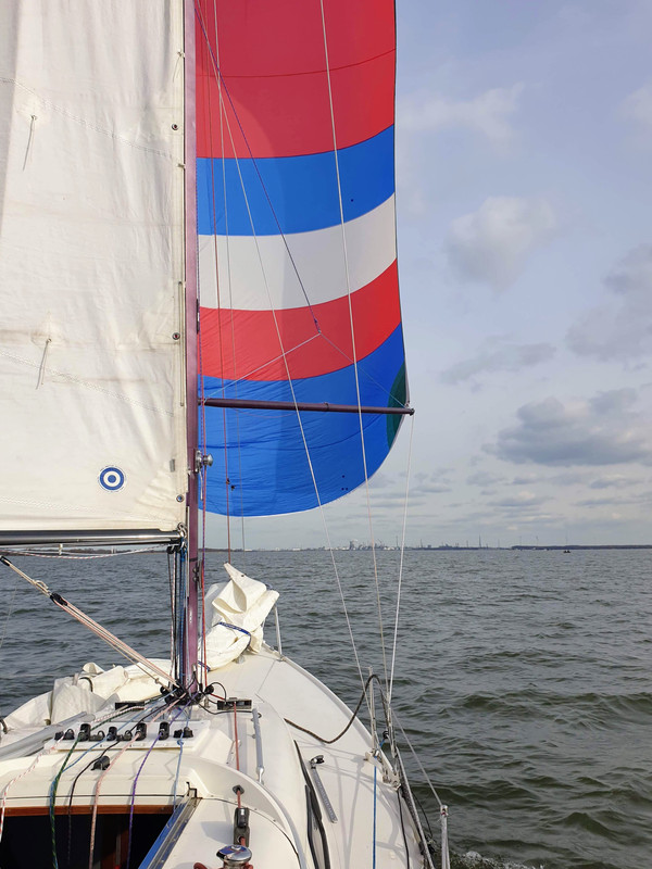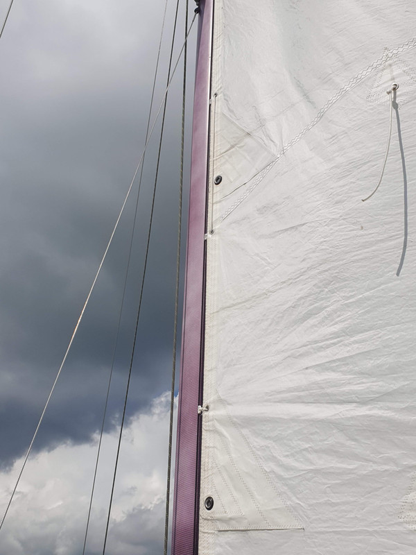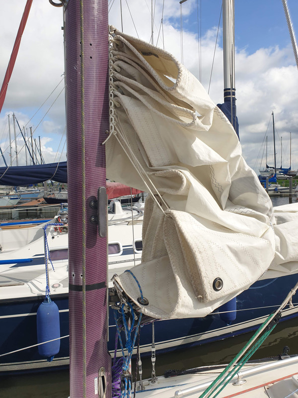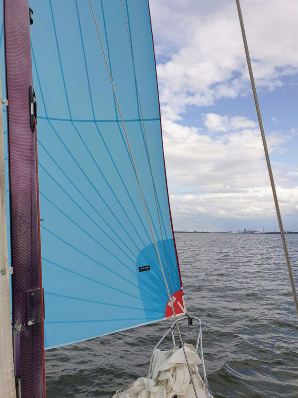 Intussen heb ik gisteren een eerste proefvaart met de nieuwe genakker achter de rug. Het gaat om een kleine maat "standard genakker" met 820cm voorlijk (voorstag Marieholm IF is 835cm) die goed past en weinig kost. Mooi vlak zeiltje als aanvulling op de oude spinakker voor halve tot ruimwindse koersen. Is wat kleiner, staat halve wind toch wat vlotter zonder boom en is wat makkelijker te bedienen met het vlagerige weer dat het gisteren was.