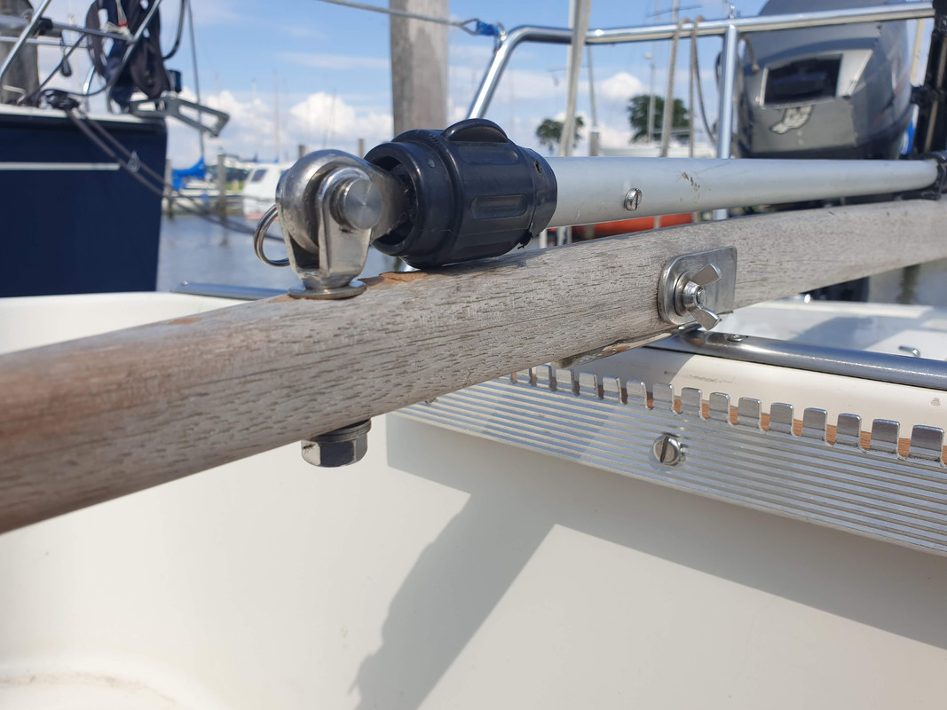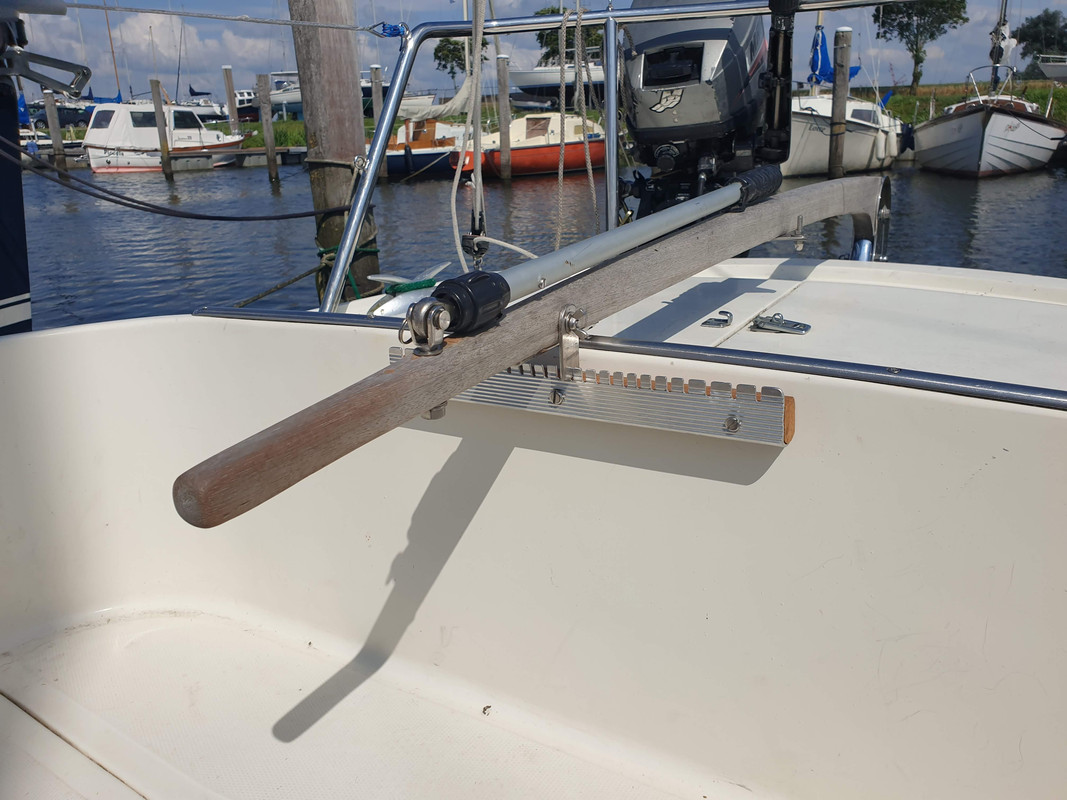 Een rvs stripje en aluminium profiel, wat boor, flex en vijlwerk en het werkt uitstekend. Simpel, niet scherp, er blijft niks aan hangen en zit niet in de weg. In de praktijk gebruik ik de (oude) stuurautomaat nu nog maar weinig en zou zelfs wel zonder kunnen. Fijn idee is dat ik nu ook stroomloos (lege of defecte accu) thuis kan komen. De boot stuurt sowieso heerlijk en je kunt hem evt ook wel wat langere stukken met vastgezet roer varen. Bij een overstag gebruik ik dat vastzet stripje zodat de boot langzaam doordraait en ik een fok kan omzetten en aanlieren.