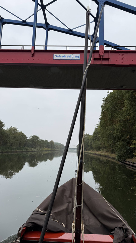 Bij de eerste paar bruggen stond de peilschaal op 5.6 mtr en daar kan ik met mast en al onderdoor. Een volgende brug stond op 5.0 en daar werd het te krap....dus pelikaanhaak voorstag los, slot van de mastkoker en staand op de bun de mast plat gelegd en naast roeiriemen, vaarboom en spriet op de daarvoor gemaakte steun aan bb gelegd. Alles bij elkaar een paar minuten werk.