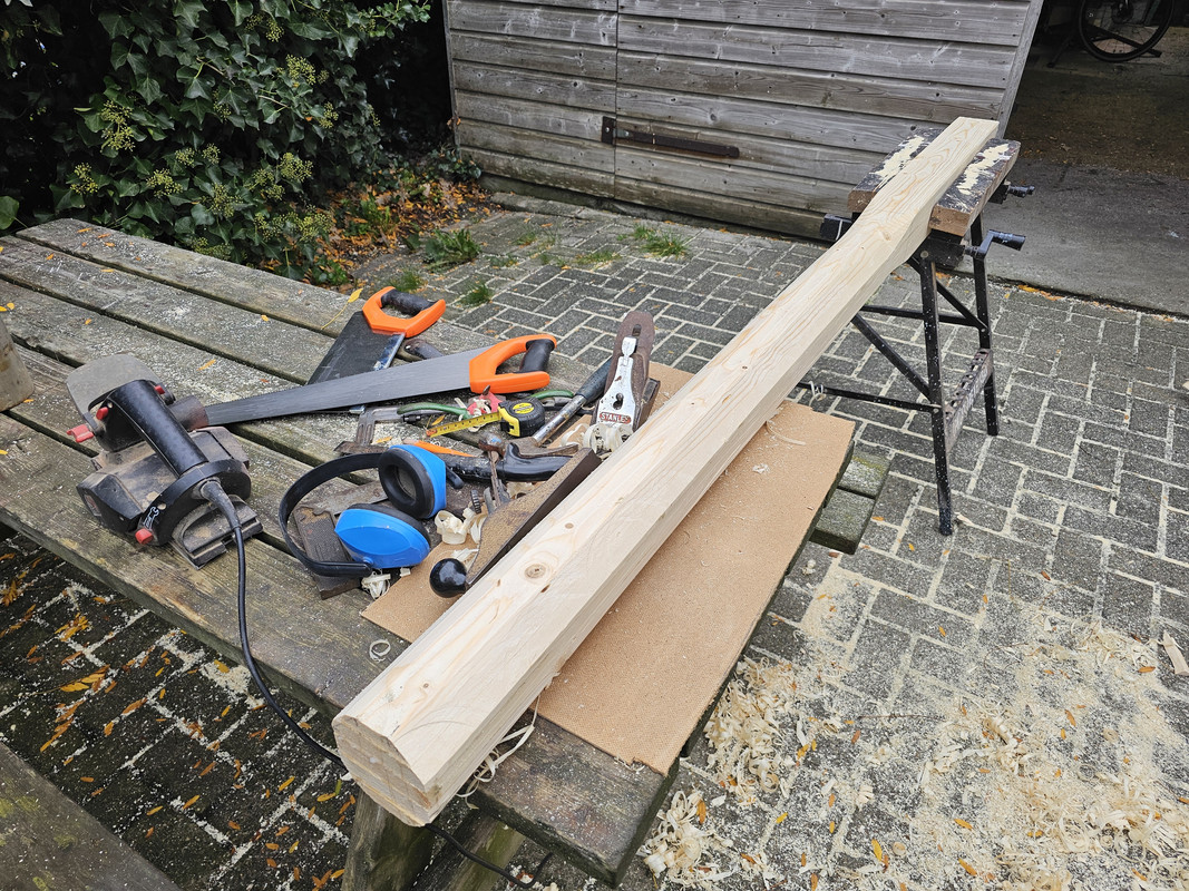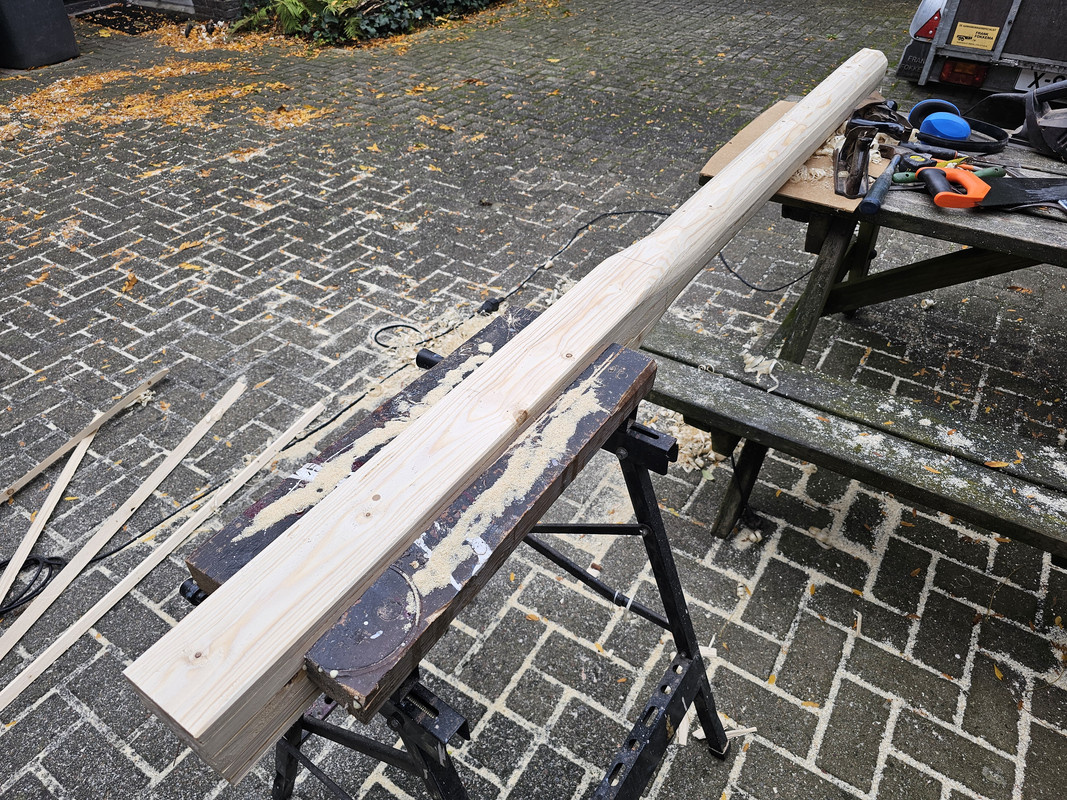 Ik had niks zinnigs liggen om een 10x10 cm paaltje te maken, dus ik heb met een pak 210cm ruw vuren en pot "bruislijm" iets in elkaar geplakt en er een redelijk net "mastje" van gemaakt.