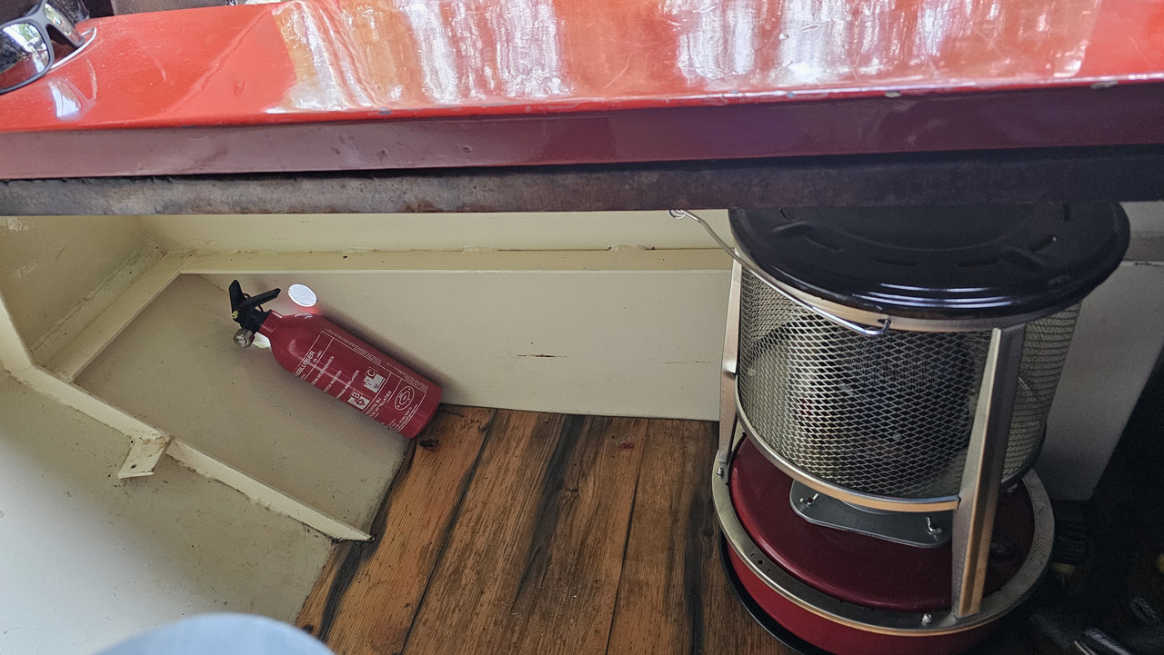 Ik heb daar onder de doft een plekje gevonden voor het oliekacheltje, dat de originele houtgestookte "vuurduvel" gaat vervangen als kooktoestel/verwarming. Daarnaast is er een makkelijke plek voor die kastplankjes.