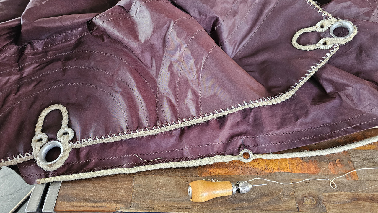 Vandaag dus met zeilnaald, gewaxte draad en "speedy stitcher" aan de slag om een extra oogje te maken in het zeil. RVS low-friction ringetje en stukje polyprop touw zodat het het netjes matched met het mooie hand-afgewerkte dacron zeil (van de Boer uit oud-Beijerland)