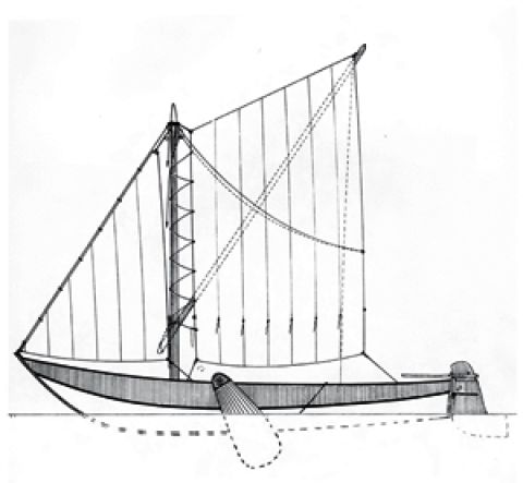 Hier staat een geilijn op waarmee je spriet en zeil tegen de mast kunt trekken en zodoende de windvang beperkt. Met een paar slagen om zeil en mast met de toplijn aan de spriet (de gaarde) zet je het zeil dan voldoende vast om de haven in of uit te varen of voor anker te gaan.