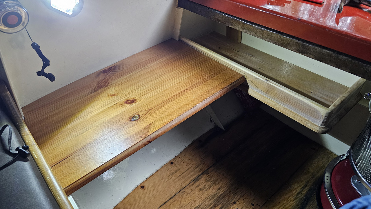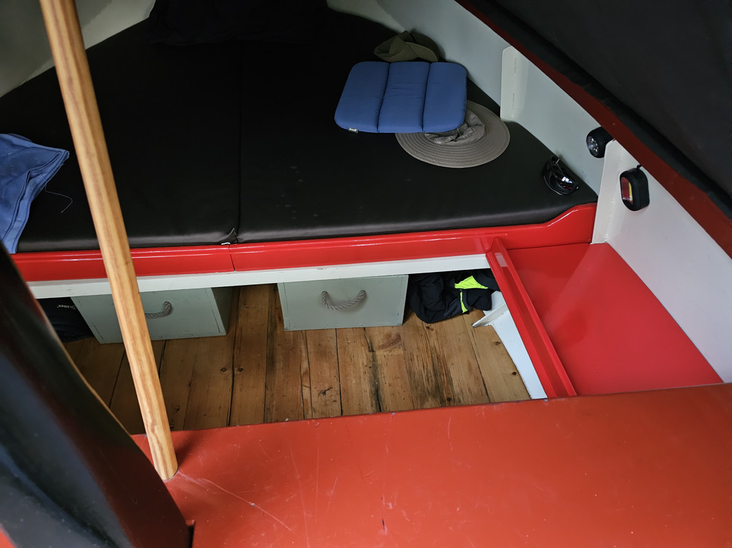 Tussen het bed in de voorpunt en het stalen mastschot/doft is er een kleine ruimte waar aan SB wat bevestigings strips zaten vastgelast. Daar lag los een plankje op, maar dat kon mooier/beter vlgs mij.