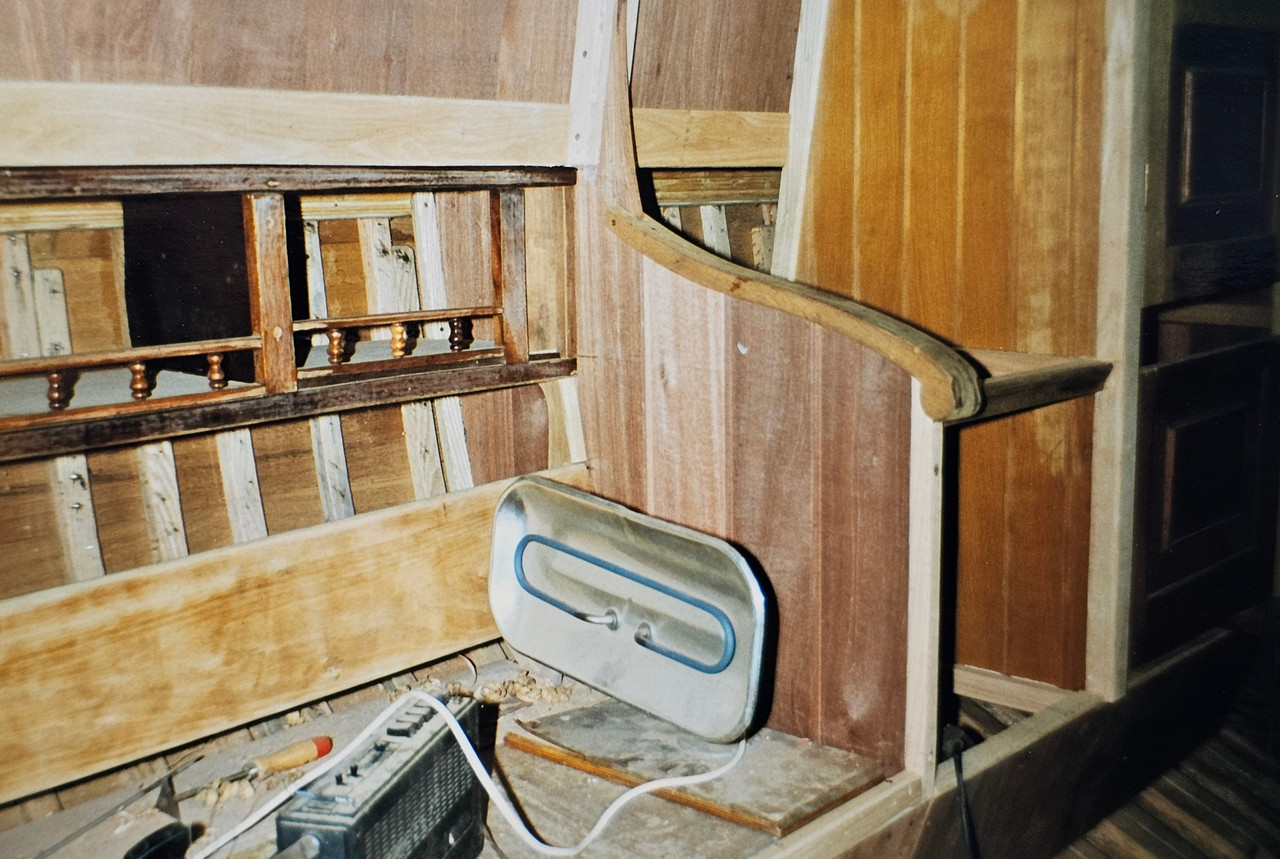 Legpatroon en (oud) mahonie randen rond de luikhoofden maakten het af. Ik heb niet gekozen voor vissingen, maar rechte naden. Ze waren hier niet nodig en ik vond het met meerdere luiken rommelig worden......en het was zo al lastig zat.