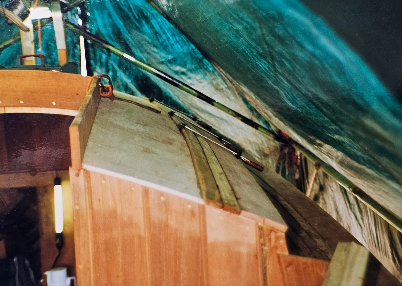 Dus wederom naar mijn houthandel voor advies en overleg. Duurzaamheid was geen enkel probleem en ik mocht weer eens op een zaterdag met "opa" aan de slag. We zochten de zwaarste balken uit de "kromme" hoop iroko en haalden daar tegen de 600 mtr 4-zijdig geschaafde 45x9 mm iroko lat uit voor een nieuw "teak" dek.
