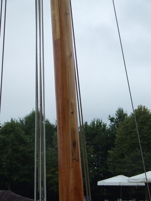 We hebben hem helemaal schoongemaakt, alle verf eraf gekrabd, dat gaat heel goed met een schaafmachine die je op 0,1 mm diepte instelt. Daarna met de schuurmachine en korrel 40, 80,120 en 280 geschuurd. Terwijl mijn personeel, zoon, dochter, schoonzoon en vrienden, dat bovenstaande deden, heb ik de scheur eerst eens uitgekrabd en gebeiteld. In het breedste deel was zat de rotterij tot zeker 5 cm diep. Met de beitel het rotte hout eruit gehaald en het gat gefatsoeneerd. Daarna met de freesmachine en een lange lat de scheur over de hele lengte netjes uitgefreesd. Dat laatste was niet zo eenvoudig, maar lukte uiteindelijk nog redelijk. Toen ik bij de plaatselijke timmerman een rood grenen lat haalde vertelde hij me dat ze bij zo'n soort klus van hout een plat vlak op de mast maken. De opening in dat vlak zagen en vervolgens met de bovenfrees het gat in de mast frezen. Zoiets hoor je pas als je het klaar hebt